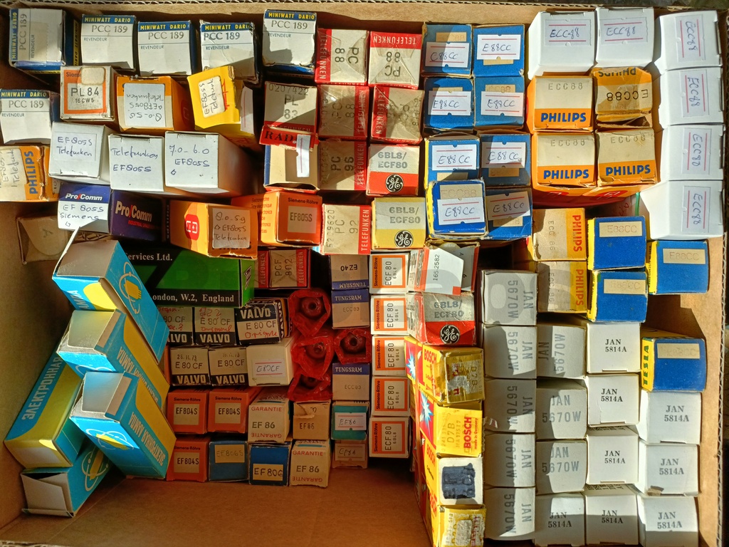 Acum 15 ani am inceput sa colectionez tuburi electronice. De atunci am strans cateva cutii, in ultimi 7-8 ani preturile lor au crescut considerabil o data din cauza popularizarii sunetului "cald" oferit de lampi si pe de alta parte scaderea stocului lampilor NOS (New Old Stock).