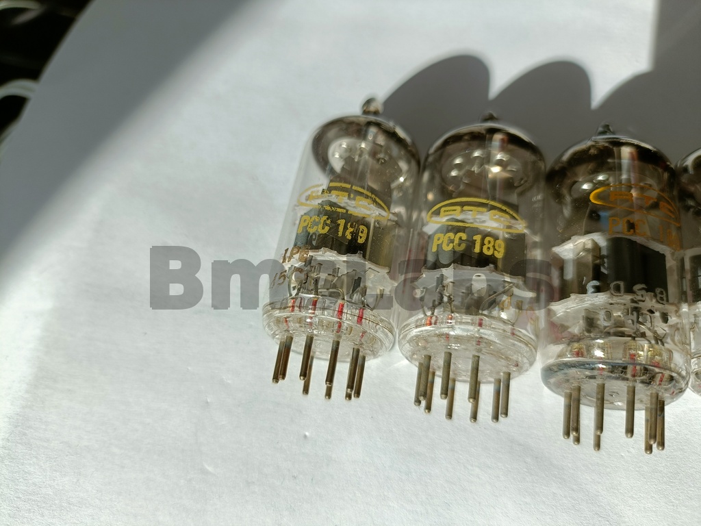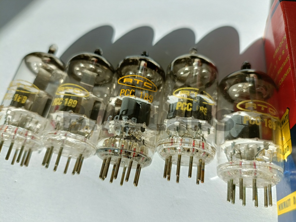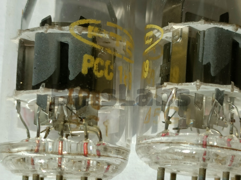 The PCC189 is a low impedance high gain double triode. The technical specification specifically states that it is built with frame grids. The valves are variable μ types for use at RF as AGC controlled devices. The low voltage high current suggests a low noise design, probably as the front end stages in a television tuner. The low anode voltage suggests both stages used as a cascode (series connected) amplifier.